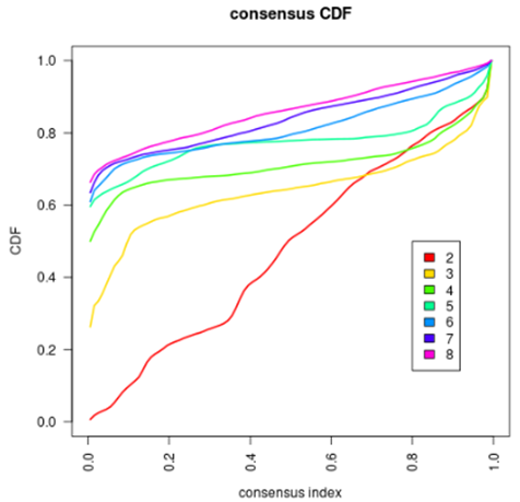 Consensus Cumulative Distribution Function(一致性累计分布图)是Consensus Cluster算法最经典的分型评价指标之一,分别将不同K值下的consensus matrix转化为向量,绘制累积分布图即可得到如下图像: