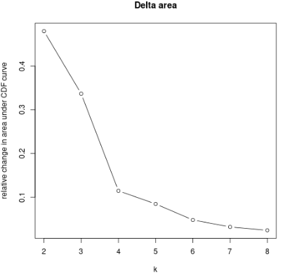 Delta Area Plot(CDF 曲线下面积的相对变化折线图) 展示了 k 和 k-1 相比CDF曲线下面积的相对变化。当k = 2时,因为没有k=1,所以第一个点表示的是k=2时CDF曲线下总面积。