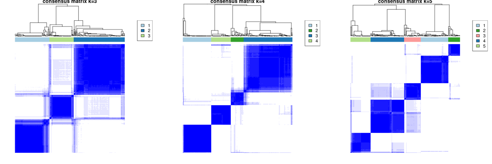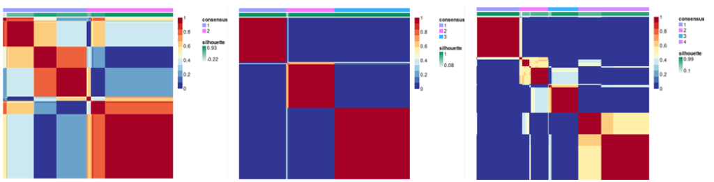 下图中,不同的k值表示不同亚型数量下对应的聚类一致性热图。