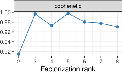 研究者Brunet建议选取曲线下降最大的前点K值作为最优聚类数;_(_PNAS. 2004, 101(12):4164-9. doi: 10.1073/pnas.0308531101.)