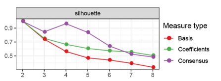 首先,如下图,NMF算法会计算每个样本的轮廓系数(Silhouette coefficient),并在聚类一致性热图上作为color bar注释呈现;